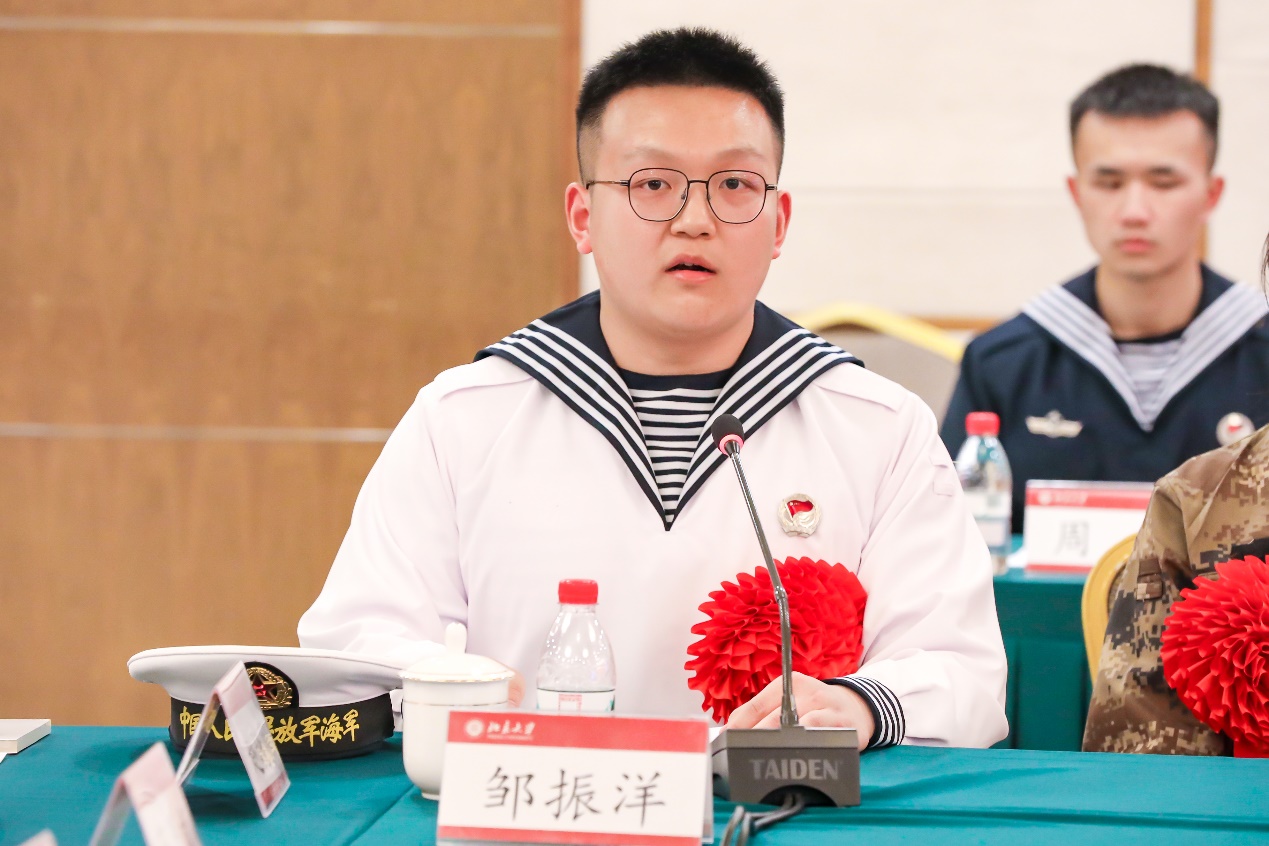 药学院2018级本科生邹振洋代表刚刚退役返校的老兵发言,他讲述了自己所在功勋舰艇部队荣誉背后的默默坚守,也表达了在平凡的岗位“立志做一颗有北大风格的螺丝钉”的心声。邹振洋对服役期间学校领导、老师的关怀表示感谢,并激励即将踏入军营的新兵同志们不负青春、勇往直前,为国防和军队建设亮出北大青年最闪亮的名片。