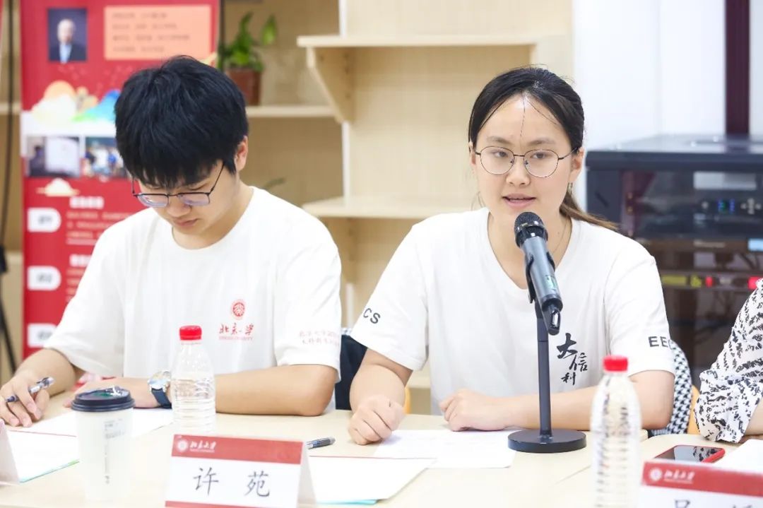 的两位学生代表对院系举办的特色活动颇有感触,在会上分享交流自己的心得与感悟。担任院学生会执委会主席的2020级本科生许苑表示,学生活动的“参与者”和“组织者”双重身份为其校园生活赋予了重要意义。她结合“1024新工科”文化节、“学术科创季”、程序设计竞赛等实例,从精神和实践两个维度探讨了学院品牌活动的育人价值。2021级本科生丁宏骏着重介绍了自己参与学院思政实践活动的经历。调研时带队教师领读入党誓词时坚毅的神情、科技园内同学们对专业问题的认真思索与交流、班级在集体活动中体现出的高度凝聚力,都成为丁宏骏在此次实践中收获的难忘回忆。作为一名信科学子,他表示自己将牢记习近平总书记的殷切嘱托,用脚步丈量祖国大地,用内心感应时代脉搏。