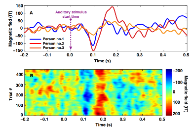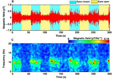 图注:左图为基于原子磁力仪的无磁屏蔽脑磁探测系统的实物图;右上图为系统所测人眼动所产生的脑部阿尔法波信号;右下图为系统所测得的听觉诱发脑磁信号。