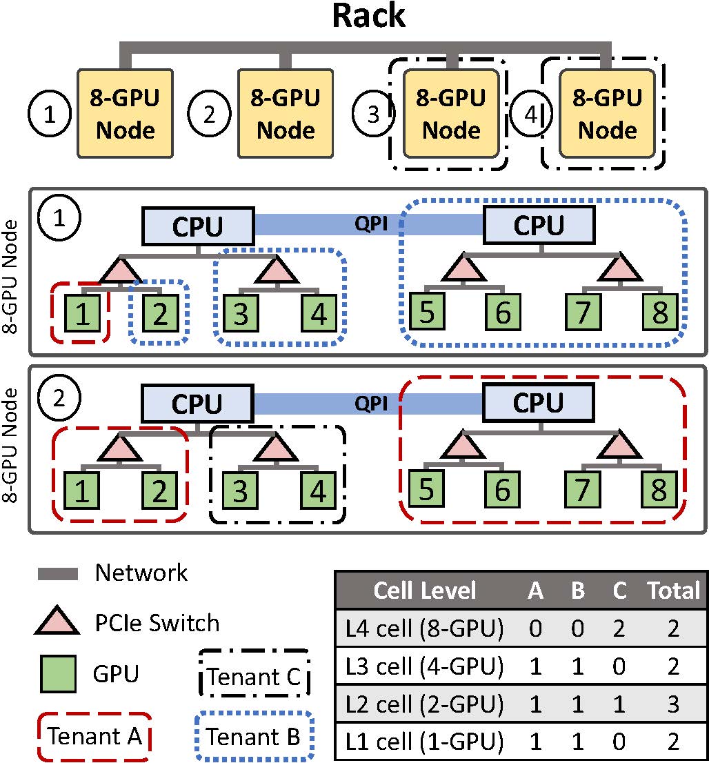 在后一篇论文中,杨智及其指导的博士研究生赵汉宇(第一作者)与微软的研发人员设计了一种新的深度学习集群资源管理系统HiveD,它考虑了深度学习模型训练效率和GPU拓扑间的关系,首次提出多租户共享安全性的概念,并设计相应的资源抽象GPU cells和分配算法,如图2所示,能够在理论上保证共享安全性。