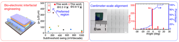 通过优化DNA-CNT界面组成,构筑基于核酸模板的高性能晶体管(左);在厘米级基底表面取向排列大规模阵列(右)