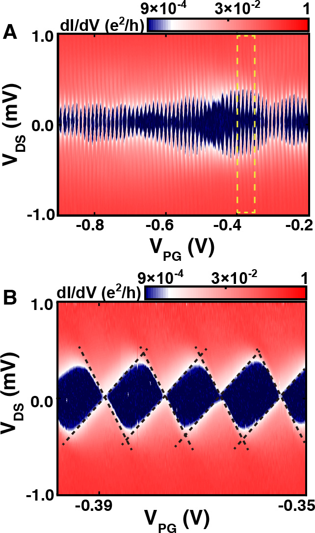 Bi2Te3纳米薄片单电子晶体管器件的电子输运特性,其中A为微分电导随栅压和源漏偏压的变化图(器件的电荷稳态图),B为A中黄色虚线部分的局部放大图