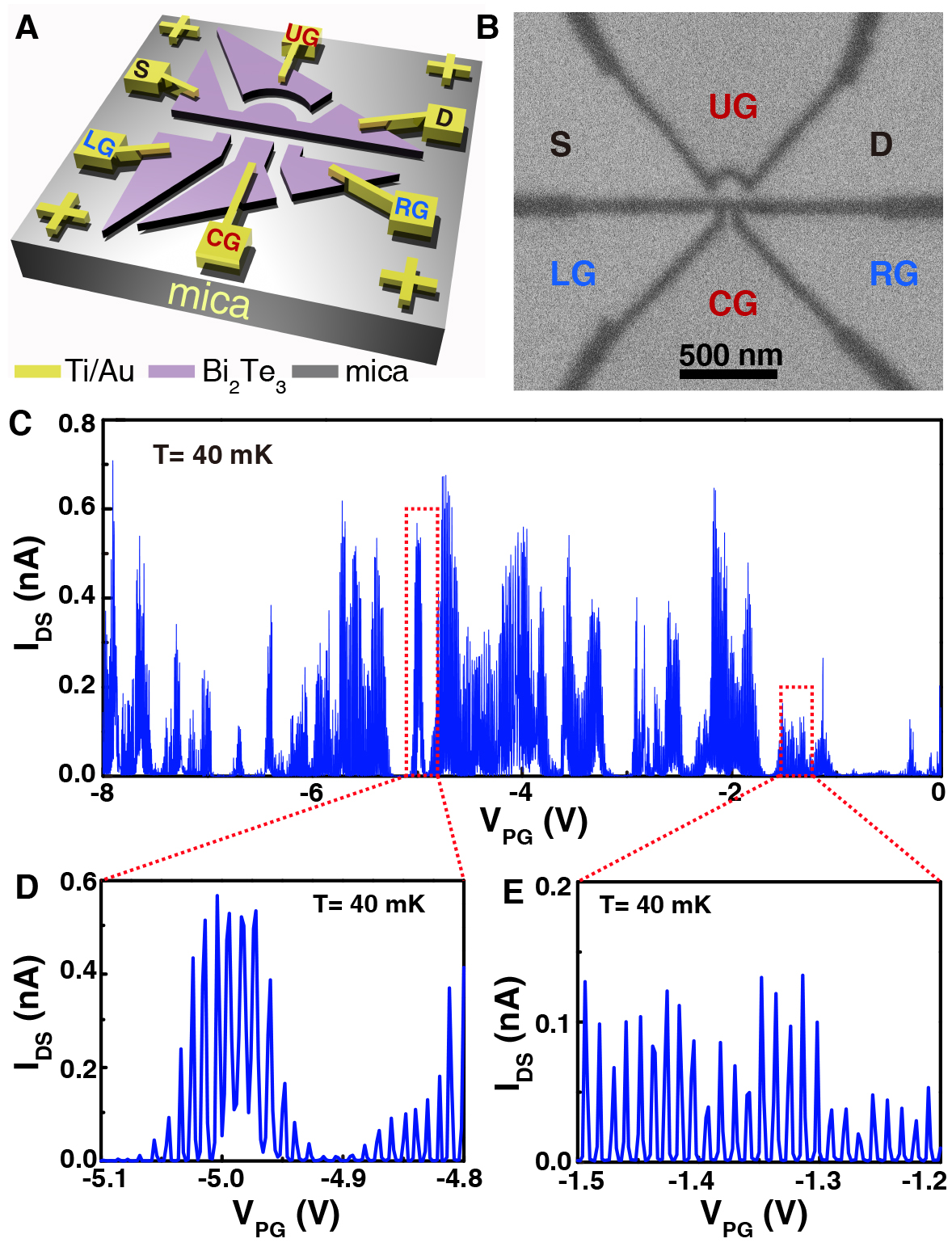 Bi2Te3纳米薄片单电子晶体管器件的结构图和实验测得的电流库仑震荡曲线,其中A和B分别为器件结构示意图和所制作的器件扫描电镜照片,C~E为实验测得的电流震荡曲线及其局部放大结果图