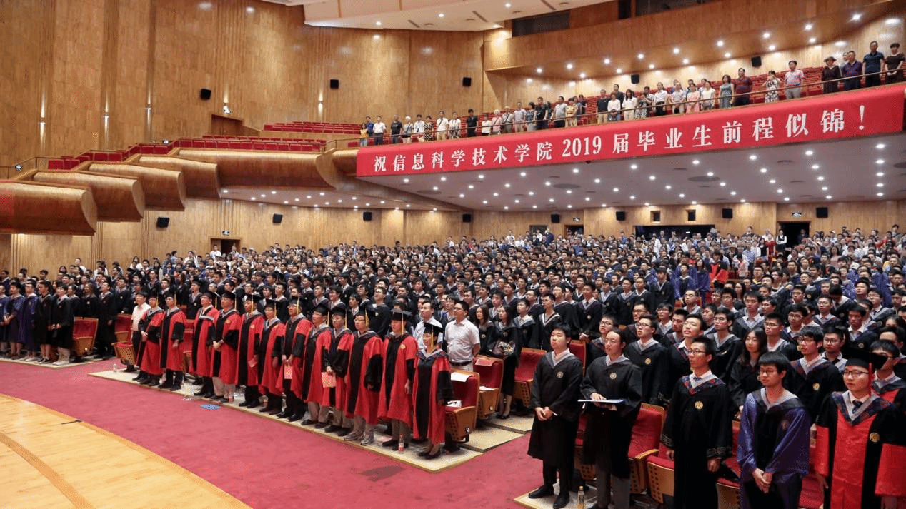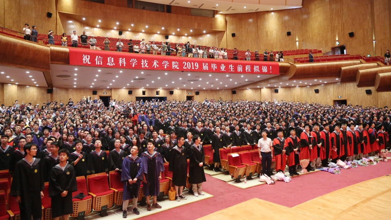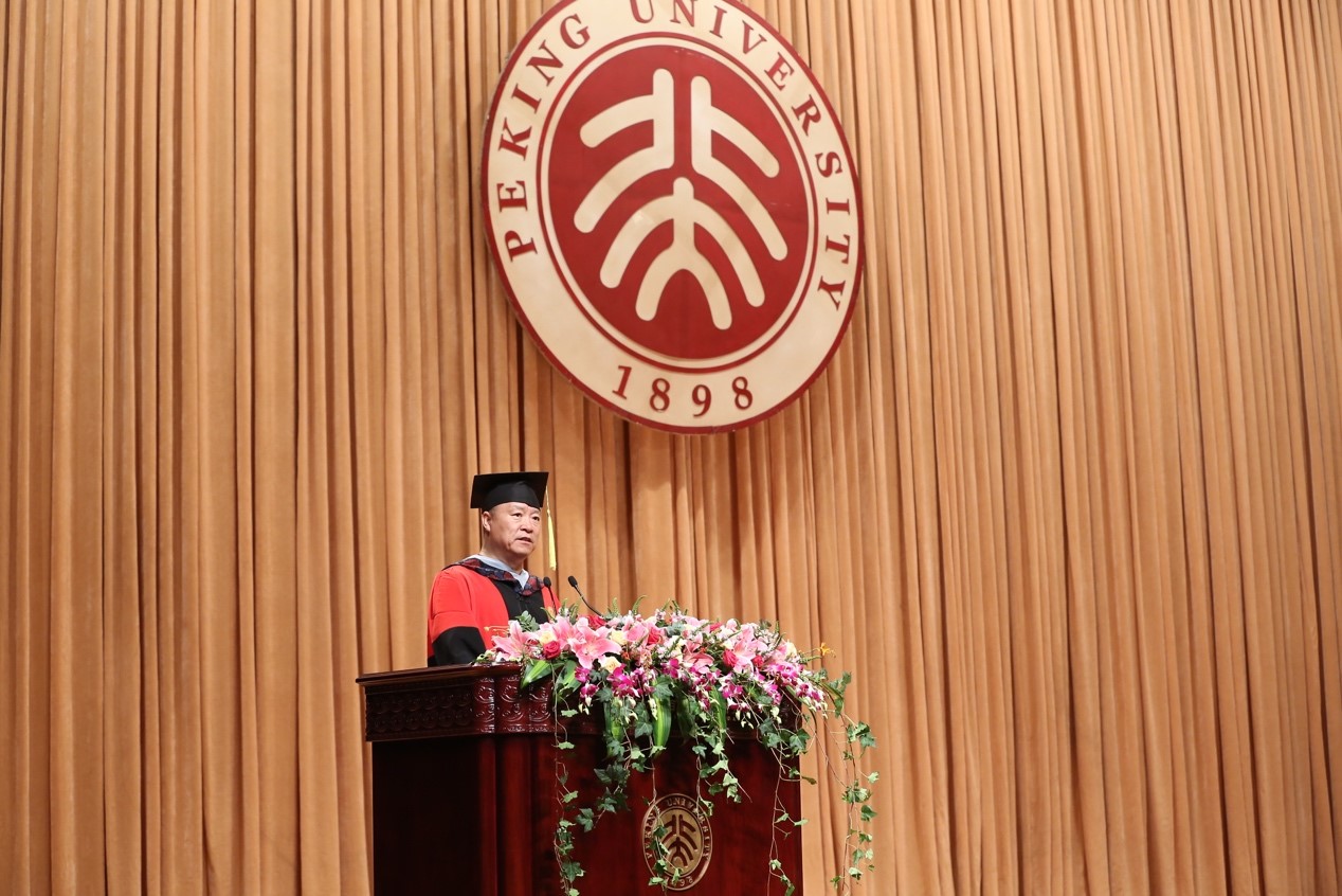 院长高文院士为毕业生致辞。他首先对毕业生圆满完成学业、顺利毕业表示祝贺,对家长配合学院育人工作表示感谢,也对信科老师为本届毕业生成长进步付出的努力表示感谢。他以祖国七十年华诞、百年五四纪念这重要的历史节点为契机,呼吁同学们做新时代新青年,毕业后仍不忘加强自身学习,从自身做起、从点滴做起,在工作中增长才干、练就本领,以青春之我、奋斗之我,为民族复兴铺路架桥,为祖国建设添砖加瓦。之后,高文院长回顾了四年中同学们重要的“北大记忆”,包括学术科研、文体活动等方面,生动描绘了同学们在校期间体验过的种种美好经历。在送别的时刻,高文院长对毕业生提出了四点寄语和希望:一是要坚持终身学习,做一名踏实笃定的勤学者,希望同学们无论身在何处,都能保持终身学习的能力和好奇心,与时代同步前进,永立潮头,绝不掉队。二是要勇于担当,做一名恒久拼搏的奋斗者,用自己的不断努力实现百尺竿头更进一步,让自己未来的路走得更远。三是要目标远大,做一名砥砺执着的奉献者,做一个对自己、对家庭、对亲朋、对国家、对社会勇于负责的人,用自己的聪明才智甚至财富回馈国家,奉献社会。四是要荣辱不惊,做一名乐观向上的励志者,始终能够保持乐观包容的生活态度,经得起社会大熔炉的历练,在不同的环境中丰富自己的人生阅历、磨砺自己的心志、锻炼改变环境的能力。最后,他指出这是个追梦的时代,完成阶段性学业只是万里长征的第一步,勉励同学们在未来的日子里继续乘风破浪、勇往直前,带着北大赋予的精神和品格、带着信科教会的智慧与能力,在世界各个地方闪耀,在更高的层面、更宽广的天地取得更大的进步。