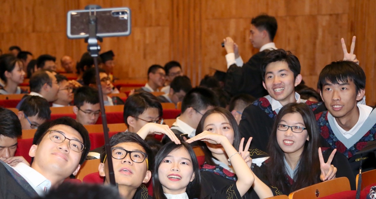 此外,典礼特别设计了“感谢师恩”、“感恩父母”和“感怀同学”环节。在感谢师恩环节,毕业生代表为在场的老师献上一束鲜花,感谢老师们多年来在学术和人生道路上的谆谆教诲;在感恩父母环节,毕业生给父母发送了一条微信,表达内心的感激和对家人的深深爱意;在感怀同学环节,同学们与坐在身边的同学相互热烈拥抱,表达对同窗好友的依依不舍之情。