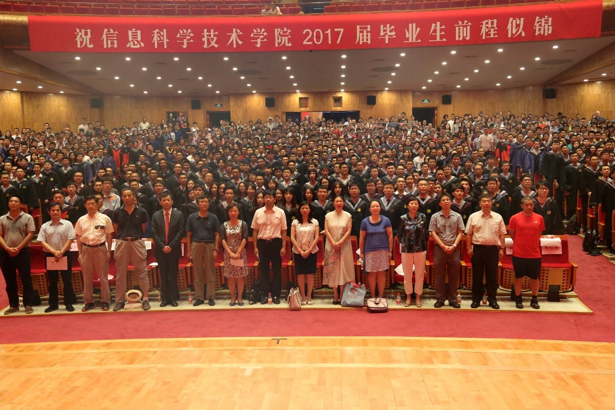 教师代表、计算机科学技术系2013级本科生班主任刘先华老师首先发言。刘老师先用一段押韵的文字生动的描述了同学们大学期间的生活,再浪漫的用“程序主函数的最后一条语句往往是返回return”、“毕业典礼commencement还有一个意思是开端”两个英文单词表达了对同学们的不舍与期待,并希望毕业生们要珍重自己、坚守信念、学会适当的放松自己。最后,刘老师用“诗人以梦为马,我们以码为梦”表达出了信科人的浪漫与豪情。