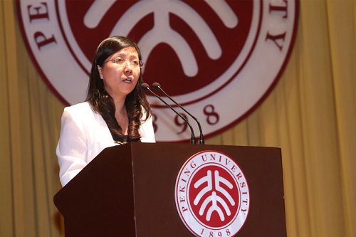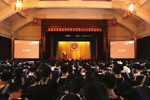 院长黄如教授为毕业生致辞。她首先对同学们通过过去几年的辛苦努力顺利完成学业,以优异的成绩从北大信科毕业表示祝贺。她回顾了本届毕业生见证的学院建院十周年庆典以及教学科研等各个方面的诸多发展变化,也历数了本届毕业生在学术科研、国际交流、第二课堂活动中的优异表现和突出成绩。黄如院长结合学院四个系的专业特点对毕业生提出四点希望。一是希望同学们能踏踏实实地焊好成长路上的每一个焊点。她希望同学们能始终保持谦逊,保持沉稳,像完成电路板的焊接一样踏实做人、做事,稳稳当当地走好人生的每一个成长阶段。二是希望同学们能学会多思考,定期做做身心的Debug。她嘱咐同学们要学会停下脚步,养成定期冥思的习惯,像为程序代码查错纠错一样,及时调整自己的身心状态。三是希望同学们能乐观包容,在不同的环境中砥砺自我。她从智能科学中的机器感知入手,鼓励同学们通过不同的环境中增长阅历、历练自我,并始终保持乐观包容的生活态度,提高对各种复杂环境的适应能力。四是希望同学们能勤奋向上,不断提高人生的集成度。她以提高集成电路的集成度作类比,希望同学们能始终保持勤奋向上的精神状态,勤于学习,善于学习,不断提高各方面素养,提高自己的核心竞争力。最后,黄如院长鼓励同学们在不懈追求理想的同时,坚持热爱生活,学会装点生活,让自己的人生充满温馨、快乐和幸福。