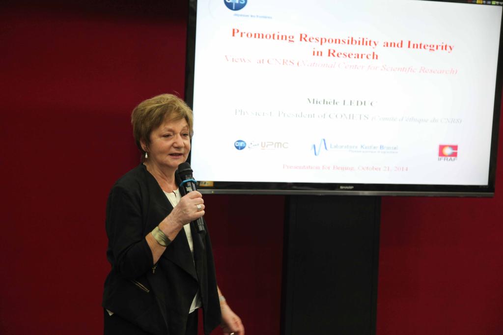 在本次报告会中,Michèle Leduc教授介绍了一些作为一个科学工作者应避免的不恰当行为,如抄袭等。并介绍了一本由法国国家科研中心(CNRS)近期出版的名为《Promoting responsibility and integrity in research》的指导书,从而指导法国每一个实验室工作者的行为与责任。