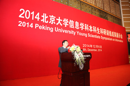 高松副校长在致辞中指出大学生的课程学习的过程是对吸取前人的经验,科研实践的过程则是探索未知,应该注重课程学习和科研实践的结合。信息学院举办如此大规模的、一年一度的本科生科研成果展示会树立了一个很好的典范。董志勇部长指出信息学院历来对本科生科研训练项目非常重视,布局合理,并取得了很好的成绩。黄如教授强调本科生科研训练的重点是如何更好的实现“学以致用”,应该轻成果、重过程。会议特别邀请到美国工程学院院士,中国科学院外籍院士,耶鲁大学的马佐平教授和Intel中国研究院院长吴甘沙先生分别做了题为“微纳电子学的前世、今生和未来”(Microelectronics and Nanoelectronicis: Past, Present and Future)和“开放式创新——大数据的未来”(Open Innovation: The Future of Big Data)的主题报告。
