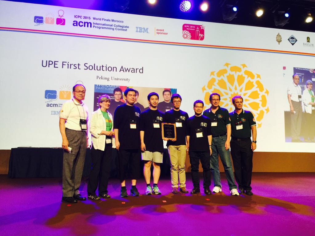 代表队夺得了全球第5名的优异成绩,并因在开场第5分钟作为解出第一道题目而获得Upsilon Pi Epsilon计算机科学荣誉协会(UPE Computer Science Honor Society)颁发的全场最快解题奖(UPE first solution award)。