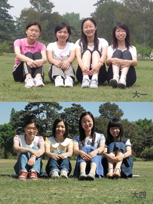 有一件事情,成了我们姐妹情深的见证。我们在统一购买了学院版T恤衫后,一起走到燕园的各个景点自拍合影。这个后来成为我们寝室的传统:每个值得纪念的时间点,我们都会到同样的地点再拍摄一张同样动作的合影。我期待有一天,我们把这些照片做成连续放映的胶片,记录我们风雨同舟、一路同行的人生足迹!