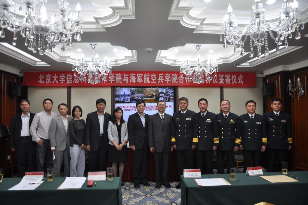 与中国人民解放军海军航空兵学院在北大英杰交流中心第一会议室签署了合作框架协议。北大副校长王杰教授,校长助理、先进技术研究院院长程旭教授,国内合作委员会办公室雷虹,信息学院党委书记魏中鹏,副院长黄如、査红彬、蒋云,海军航空兵学院院长李建民、副院长梁旭,参谋长穆守强,政治部主任闾成宏,装备部部长李喜龙,副参谋长李德军,司令部教保处处长宋守华、科研处处长张佳利、宣传处处长肖木才等出席签署仪式。仪式由査红彬副院长主持。