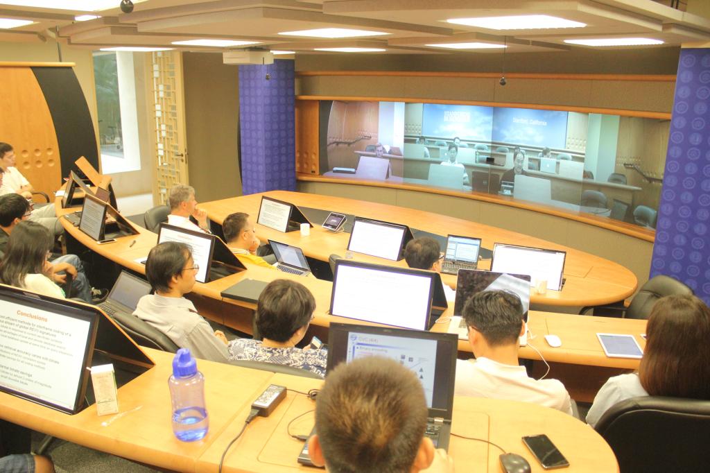 斯坦福中心是两校进行教学、科研交流的基地,配有先进的视频会议系统,通过大屏幕可以实现与斯坦福大学在同一会议室进行面对面交流的“沉浸式”效果。北大信息学院田永鸿教授、王亦洲研究员、熊瑞勤研究员、马思伟教授、段凌宇副教授,中国科学院计算技术研究所王瑞平副研究员,以及斯坦福大学的六位代表分别做了学术报告。双方就各自最新研究成果展开充分交流。由于双方的研究方向高度相似,研究进展也都处于国际前沿,因此焦点集中,讨论深入,并就后续合作达成了具体计划。会议效果显著,双方都认为有必要采用这种方式定期交流,共同发展。