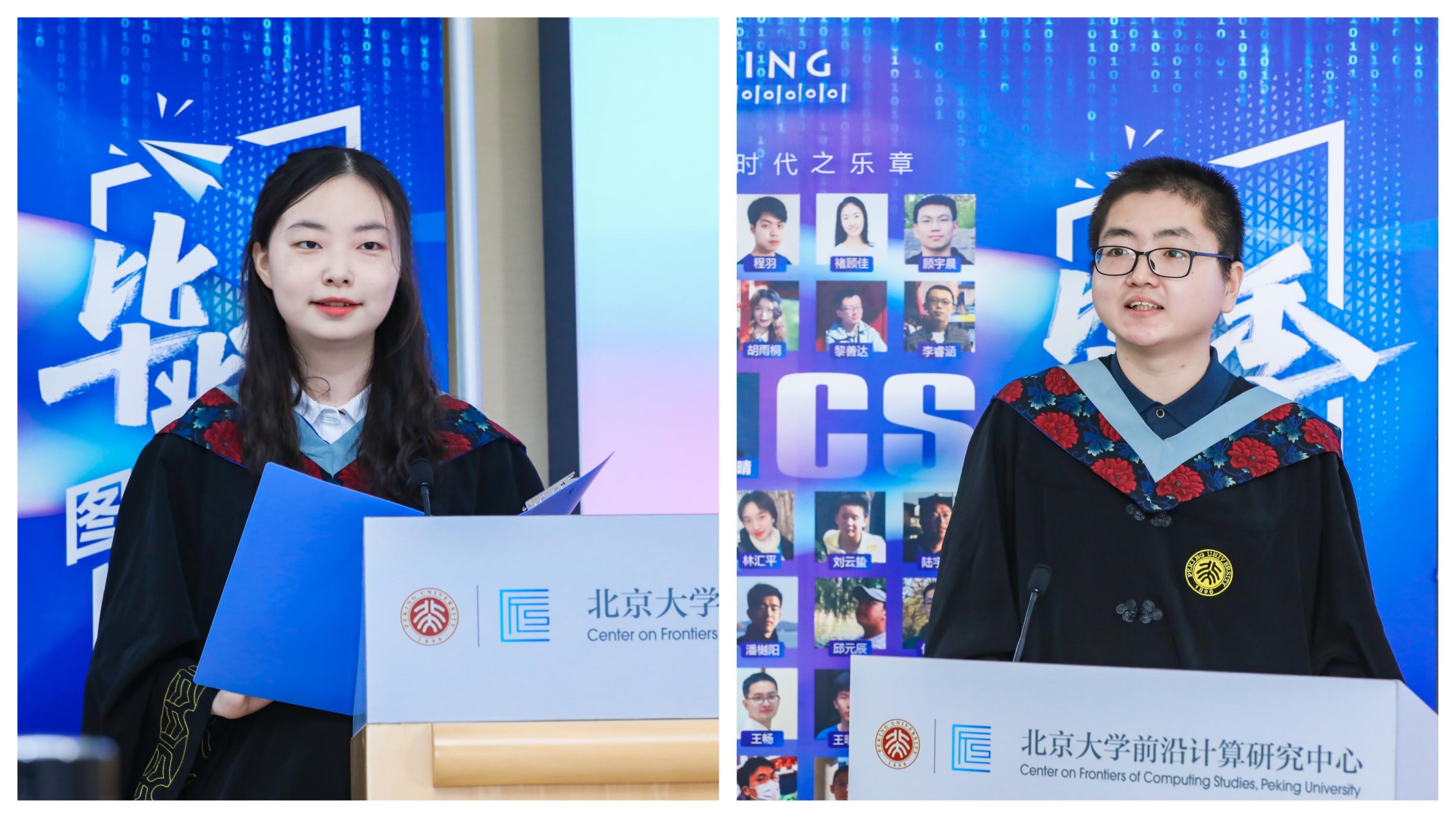 毕业生代表发言环节,陈旭雯同学回顾了自己初入燕园时对人工智能领域的好奇,并讲述了自己三年来学习和科研的心路历程,对前沿计算研究中心的老师与同学们表达了感谢;郭资政同学感谢图灵班培养和保护了同学们的好奇心,并让其崭露头角,在将来的科研和工作中,能够激励自己做喜爱的研究,用好奇心来点燃自己的热情。