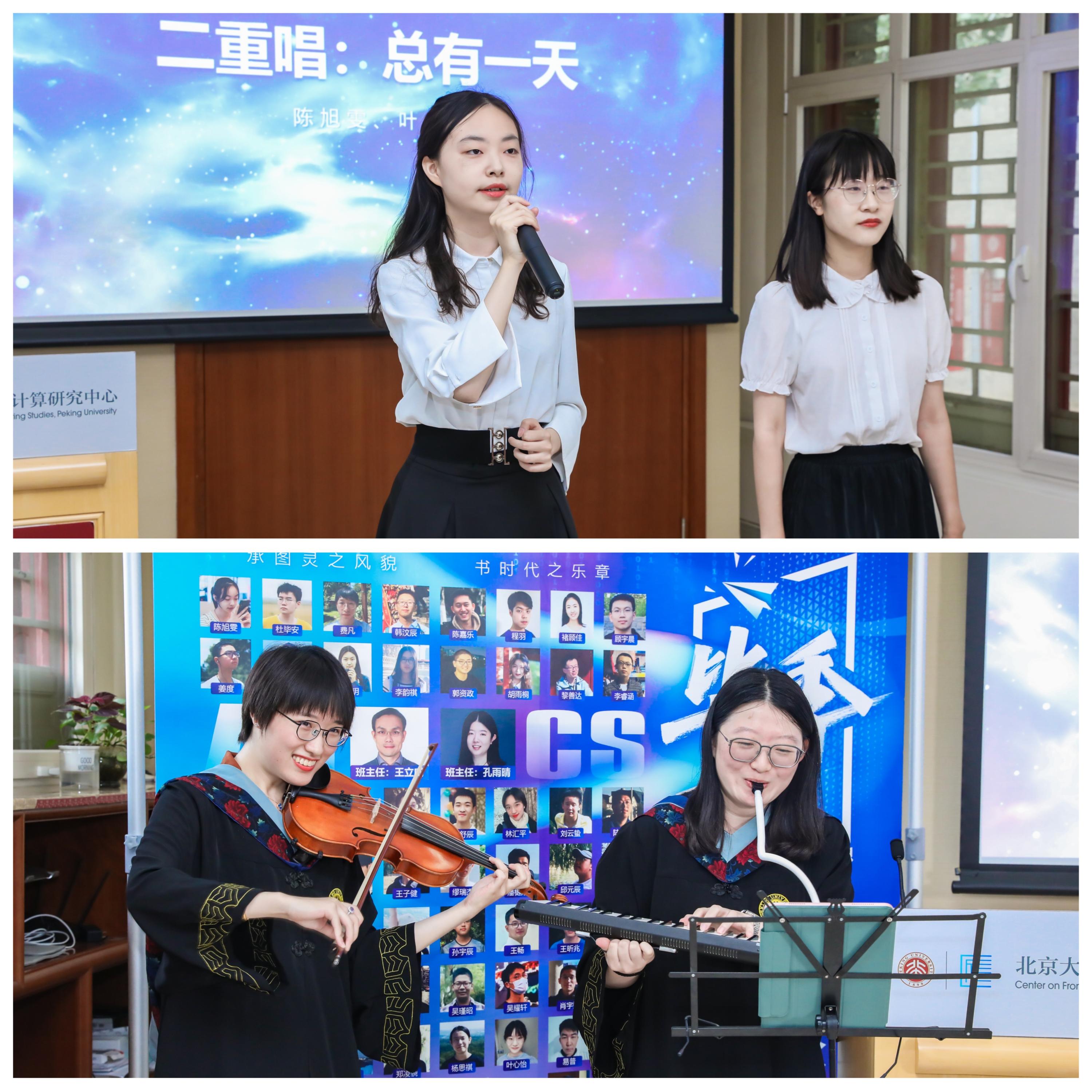 毕业生节目表演环节,陈旭雯和叶心怡同学为大家带来二重唱《总有一天》,优美的旋律与动人的和声获得了大家经久不息的掌声;林汇平和奚佳琪同学自创的互动节目《游戏音乐串演》,一首首熟悉的游戏音乐和大家的抢答让现场气氛更加热烈。