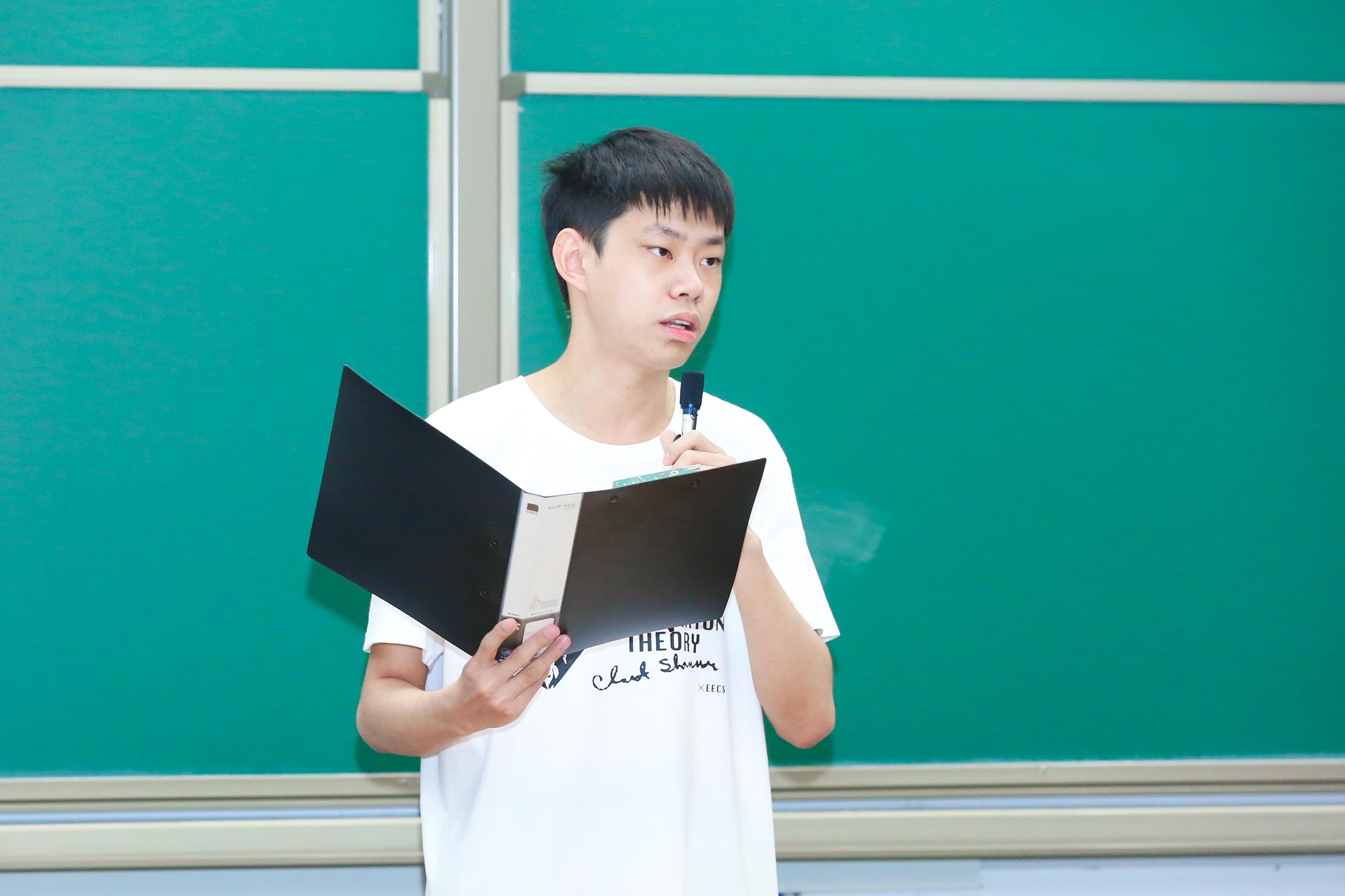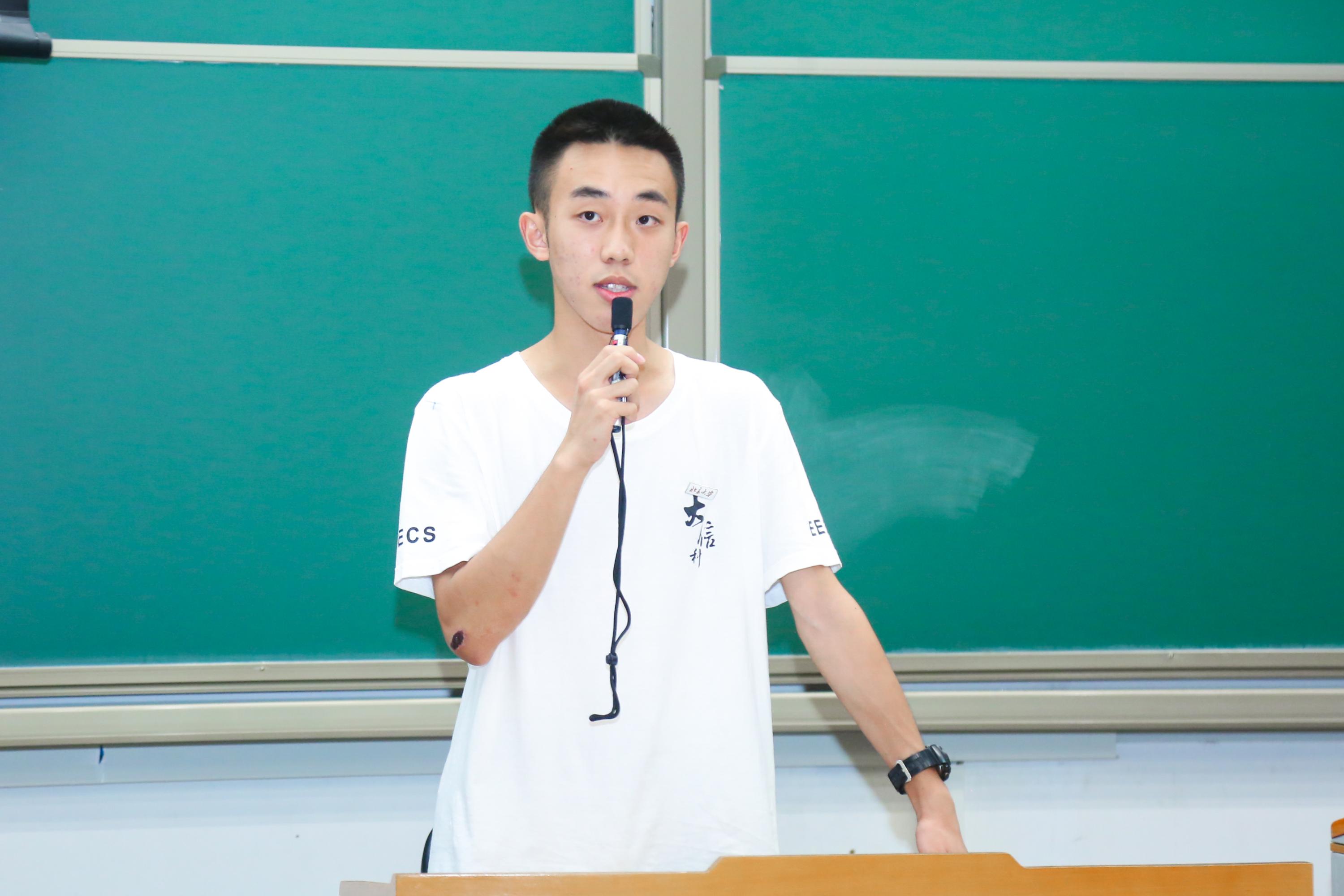 学院学生会主席、2019级本科生朱天翔同学作为老生代表,向新生们分享了自己的学习生活经验。他强调,进入评价体系多元化的大学,大家需要转变观念,和别人比较的大学生涯将是痛苦、盲目、浮躁而无意义的,真正需要比较的只有自己和自己的期望与目标。他鼓励新生们按照自己的计划和节奏,选择自己内心热爱的事情去尝试,特别是理工科同学应该尝试接触一些音乐、艺术、历史等人文素养方面的课程,在学好专业课的前提下,利用通识教育资源培养一个受益终身的爱好,也是北大作为底蕴深厚的综合性大学给予同学们最为有价值的馈赠之一。
