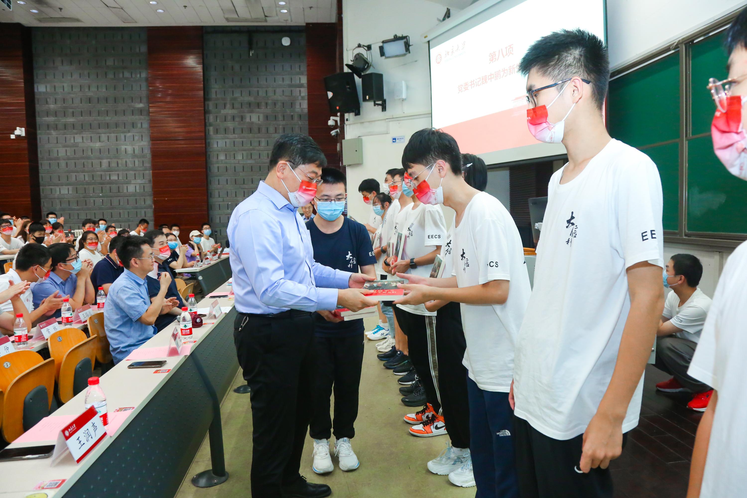 魏中鹏老师向2022级各班的新生代表赠书《习近平与大学生朋友们》。书中讲述了习近平同志在河北正定、福建、浙江、上海和到中央工作以来,与大学生们交往交流交心的故事,真实记录了他对青年特别是大学生始终如一的关注关心关爱。魏老师寄语全体新生,牢记习总书记对广大青年的嘱托,将个人理想与中国梦紧密结合,为实现中华民族伟大复兴献上属于北大青年的力量。