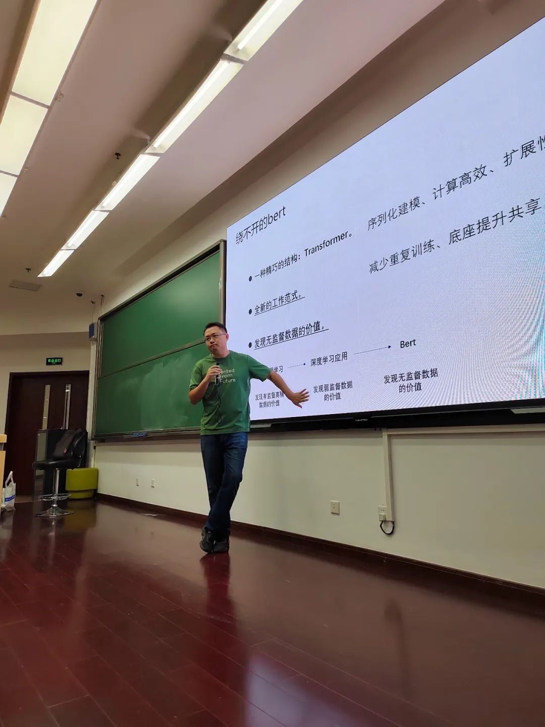 紧接着,魏老师为我们讲述了BERT的相关知识。BERT,即Bidirectional Encader Representation from Transformers。它采用了双向编码模型,通过预训练--深入训练--双向转换--语言理解四大模块,并且引入了带mask的语言模型训练,这种训练通过不同概率的随机替换单词“逼迫”模型更快地学习原始自然语言说话的方式,进而做出合理的断句和判断并对下句进行预测。此外,预训练的语言模型使得未来所以的开发者直接继承,减少重复训练,底座提升共享,深受工程师的喜爱。自此,人们又发现了发现了无监督数据的价值,从语言训练来到了业务训练。