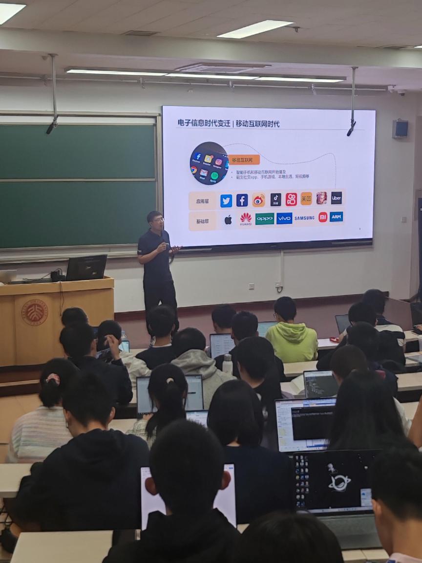 殷积磊老师提及,现在我们处于互联网高度发达的时代,诞生了前所未有的数不胜数的新概念,门户网站,网络游戏,搜索引擎,电子商务......互联网的普及应用成为不可逆的时代潮流,互联网的发展从开始时的PC到移动互联网,到如今,我们的社交,生活早已离不开互联网。而互联网还在继续发展,alpha Go、chat-GPT等的出现,意味着我们将会迎来人类历史上的大变革-人工智能时代,诞生智能机器人,智能汽车,进入万物互联时代,产生智能交互,“地球村”里的村民天涯咫尺。可以说,电子信息技术的变迁到目前为止出现了三波浪潮,互联网的到来是第一波浪潮,移动互联网的诞生是第二波浪潮,人工智能时代会是第三波浪潮,在这些变革中更是崛起了无数的科技公司,Intel、AMD、NVDIA、华为、苹果、寒武纪科技.......互联网的发展离不开算法、算力与数据,而在这时代的浪潮中,每个人都有自己的责任和使命,只有不断成长,才能在时代中发挥更大的作用,乃至引领时代的发展。