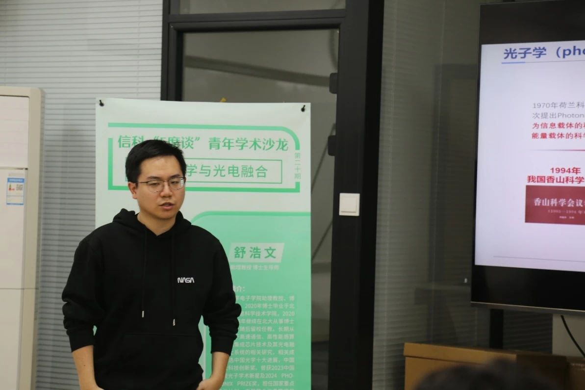 电子学院助理教授、博士生导师舒浩文老师受邀进行了以“集成光学与光电融合”为主题的分享。学院团委书记吕媛老师参加了本次活动。本次沙龙由院青年志愿者协会汪浩霖同学主持。