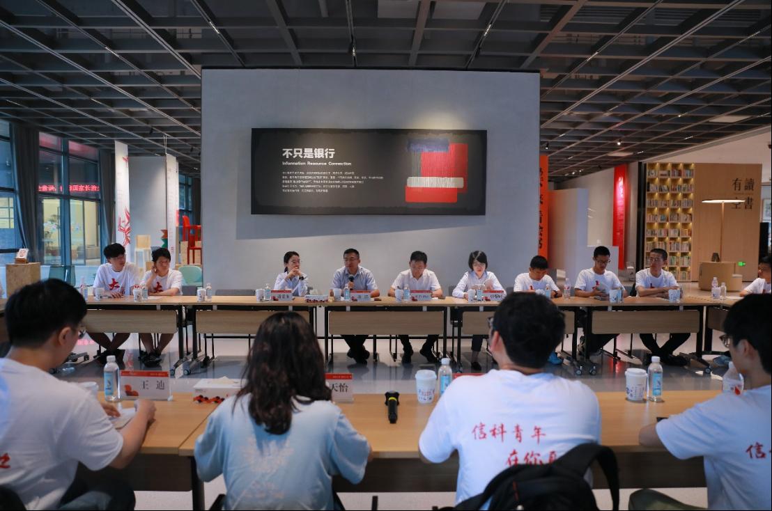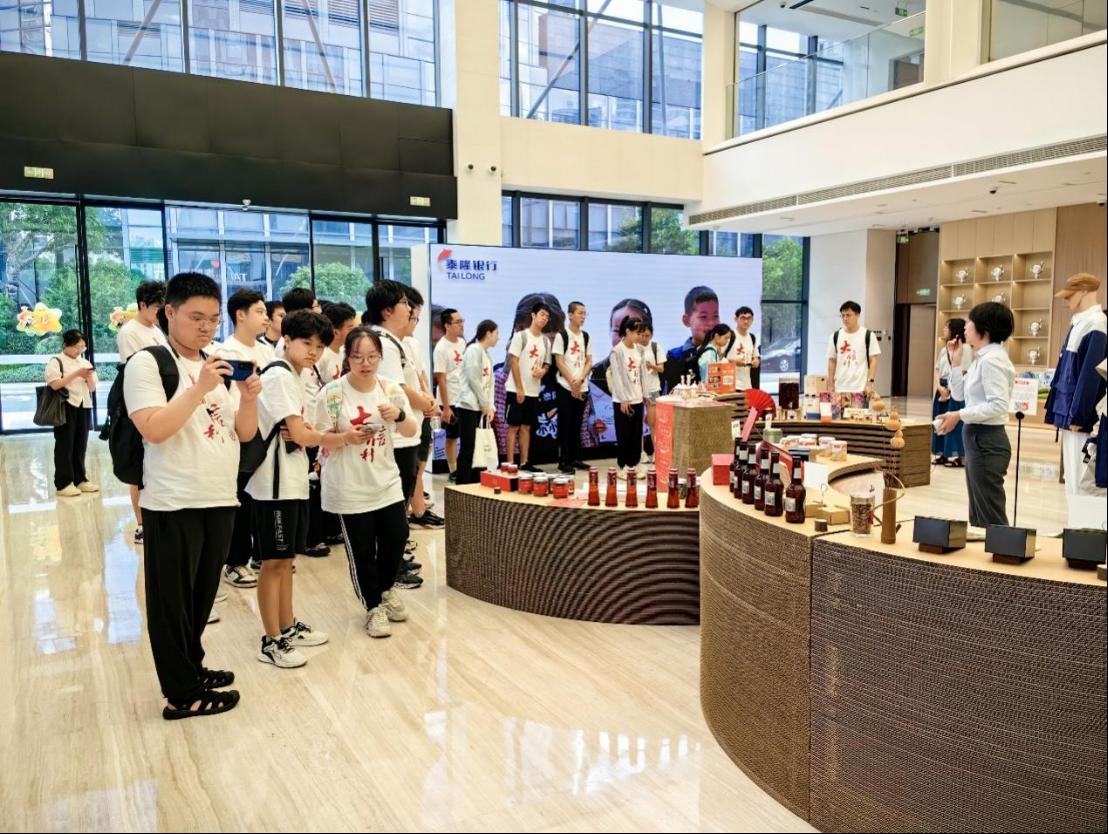 16日下午,实践团前往泰隆银行进行参观和座谈。刚进入大堂,同学们就惊叹不已。这家银行的大堂没有传统银行中的柜台,而是一个对当地特产,艺术品的展览;再往里走,是一个安静,雅致的图书区,为当地市民提供借阅和自习空间;接着是一块各式各样精美的椅子的展区,最靠里则是成人网站墙和会议区。座谈会上,银行行长、经理等领导为同学们详细介绍了银行的主要业务——为小微企业提供信贷服务,以及企业管理方式和优秀文化。同学们纷纷踊跃提问,从疫情后的经济形势,到ai技术在审核贷款条件上的应用,负责人一一详细解答,让大家收获满满。