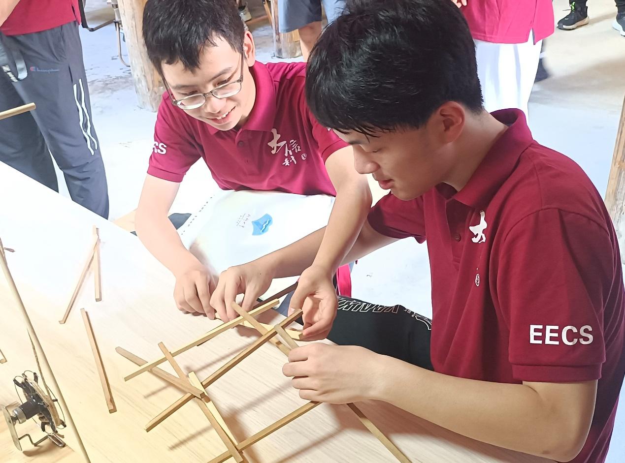 实践团同学亲手实践搭建廊桥模型
