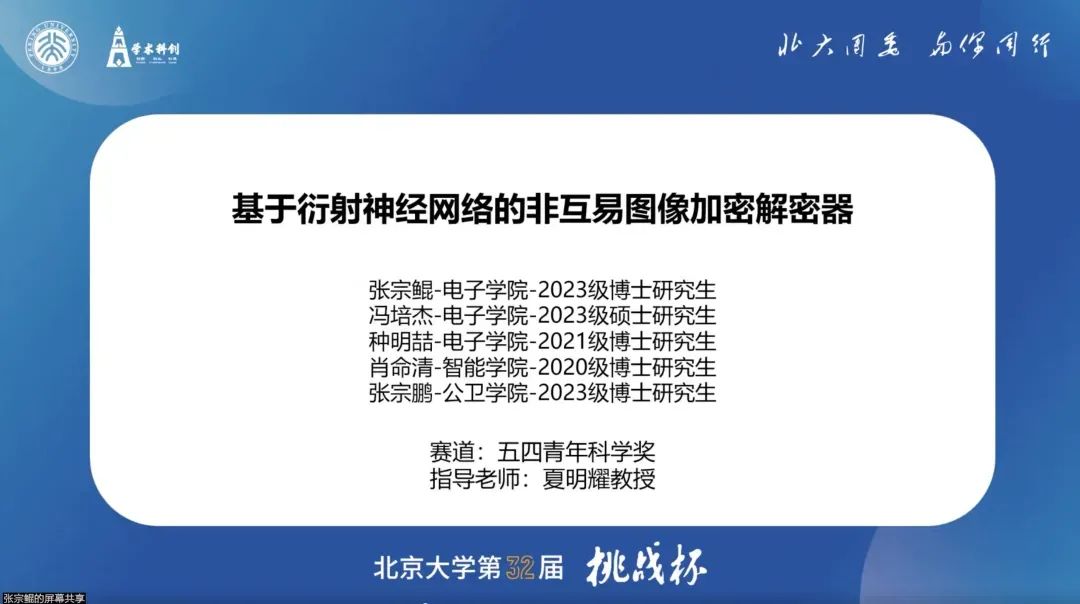 电子学院的张宗鲲同学分享了“基于衍射神经网络的非互易图像加密解密器”这一工作。随着神经网络模型越来越大的发展趋势及其在越来越多领域的应用,其能力与功耗严重受限于硬件的计算能力规模与能源开销。光计算是一种利用光子独特性质的新的计算机制,其相比电子器件,在显著提升数据处理速度和降低功耗等方面具有极大的潜力。与此同时,图像加密在当今信息技术高速发展的背景下变得愈加重要,图像数据的安全和隐私保护成为了一个紧迫的问题。基于此,本作品利用衍射神经网络的互易特性,实现了矩阵变换机制和自编码器机制下的图像双向加密和解密,还具有更高的灵活性,安全性与普适度,能够适用于更加广泛和多样化的加密场景。随后,张宗鲲同学还分享了参赛注意事项以及参赛时各个时间节点的具体工作内容。最后,她强调在答辩时着装应尽量正式得体,并注意和评委的眼神交流,在必要时可以加上一些肢体语言。