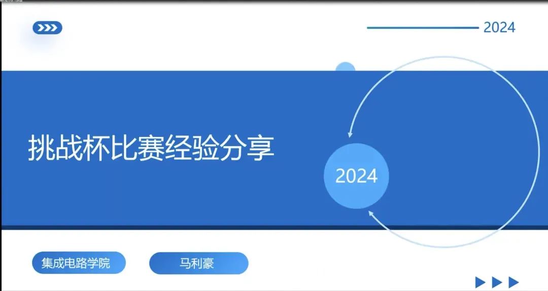 集成电路学院马利豪同学分享了“三维声源算法:声矢量阵列结构设计与系统实现”这一工作。声源定向技术因其广泛应用前景而备受关注,而实现声源定位的过程中,传统方法依赖于声压传感器阵列,相比之下,单个声矢量传感器凭借其对矢量的捕捉,能够进行基本的声源定向,进一步通过部署声矢量传感器阵列,可以收集到更为详尽的声矢量信息和空间信号,为提高生源定向的精确提供了有力支撑。随后马利豪同学进行了经验分享。他强调选题时应该充分考虑题目内容的创新型与可行性,阐明背景和逻辑结构。报告中对于数据要用图表等直观表现结果的方式呈现,结果讨论中要结合实际意义、优化改进和未来发展路径进行详尽讨论。最后马学长认为,除了报告的内容要严谨完整之外,团队协作和产品思维也是很重要的,“挑战杯”的比赛考验着团队人员的多方面能力。