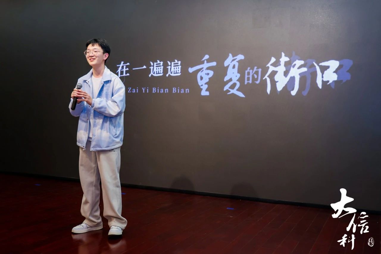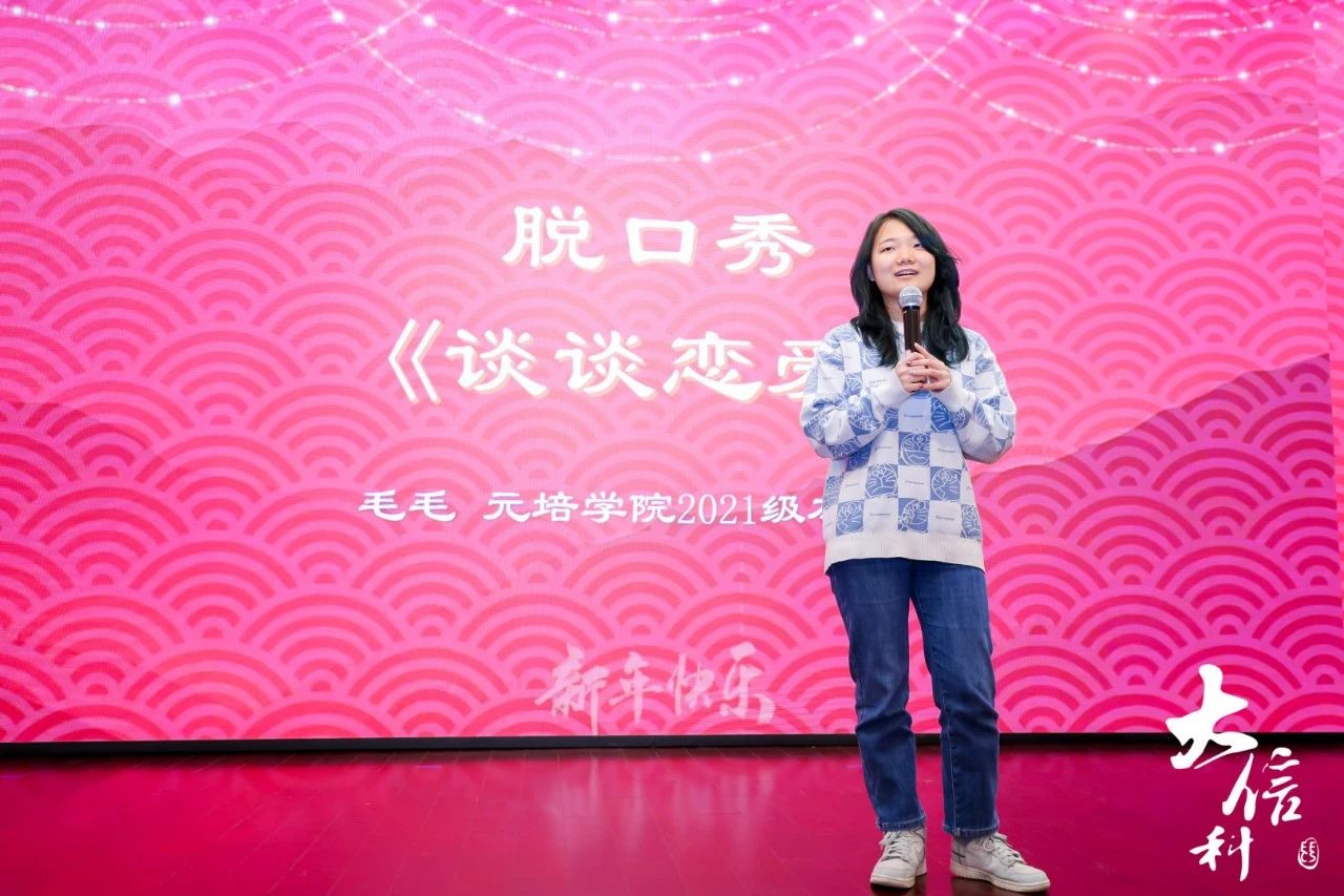 朱文昊同学和陈可同学分别演唱了《小镇姑娘》与《人是_》,演唱层次丰富,以悠扬的旋律和极具穿透力的声音触动着全场所有观众的内心。毛毛带来的脱口秀《谈谈恋爱》,诙谐幽默的语言使得场上的气氛无比轻松。