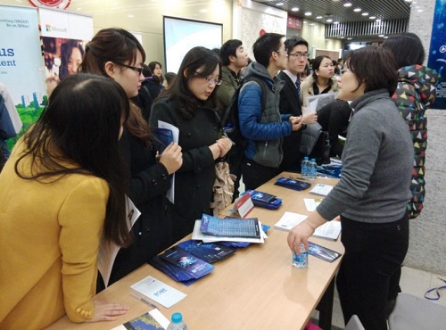 同学们向企业代表咨询求职问题