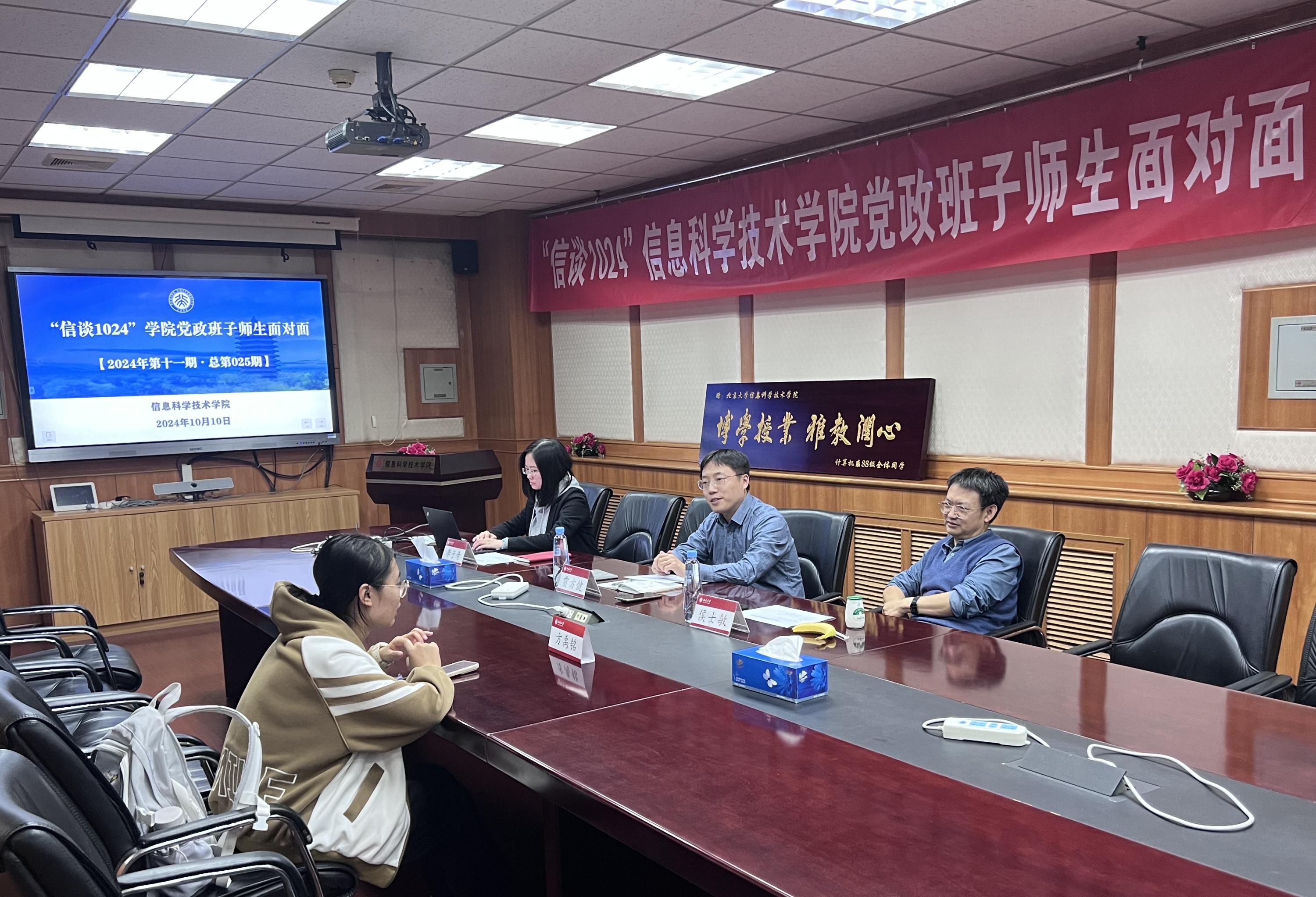 20241010日中午,成人网站 在理科二号楼2111会议室举办2024年第十一期(总第25期)“信谈1024”学院党政班子师生面对面座谈会,本次座谈会采取个人单独面谈的形式,对报名同学的问题依次进行全面答疑解惑。院长侯士敏、党委副书记贾方健,成功报名的学生代表参加了本次面谈。活动由学院学工办主任李子奇主持。