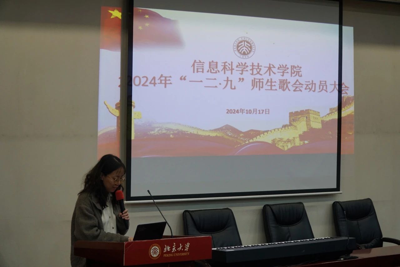 学院党委副书记贾方健老师、团委书记吕媛老师出席了动员大会。大会由团委副书记刘天怡老师主持。在热烈的气氛中,信科学生会文艺部部长肖天尧首先上台,向大家介绍了“一二·九”歌会的整体时间安排和详细的排练计划,同时逐一介绍了各个工作组的负责人员及其具体职责。他强调,分四声部的合唱任务,不仅要求大家有扎实的歌唱功底,更是在考验同学们之间的默契配合,这样才能将最美的和声呈现给观众。在合唱组、舞台组、后勤组的通力配合下,大家只要齐心协力、全情投入,定能让这次歌会圆满成功。