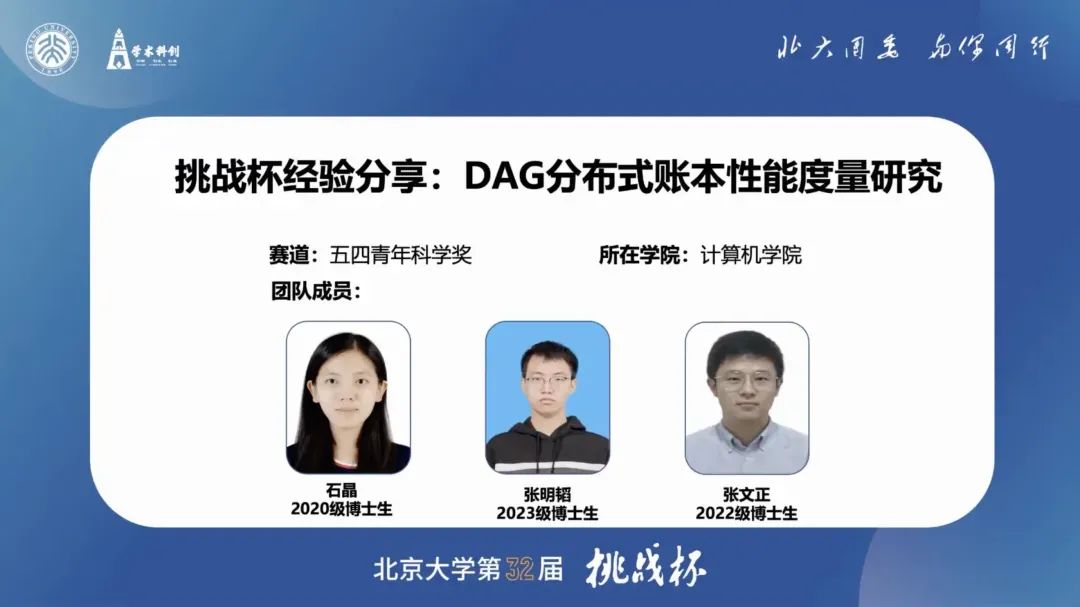 计算机学院的石晶同学分享了“DAG(有向无环图)分布式账本的性能度量”这一工作。DAG账本与传统链式账本有所不同,它通过复杂的链接关系实现更高的数据并发处理能力,其设计允许并行记录区块数据,使其在分布式账本领域展现出巨大潜力。石晶同学所在的团队对DAG的性能进行了深入分析,克服了DAG结构建模和性能指标设计中的复杂挑战,旨在推动其技术发展与应用。在分享参赛经验时,石晶同学建议合理评估项目的可行性,建议同学们要评估团队成员的能力,做好时间规划,以确保项目的顺利推进;此外,石晶同学也建议要注重项目的创新和实用性,可以考虑通过一个演示(Demo)来展示项目的独特性和实际应用价值;建议选择技能互补的队员,实现协作效果最大化。
