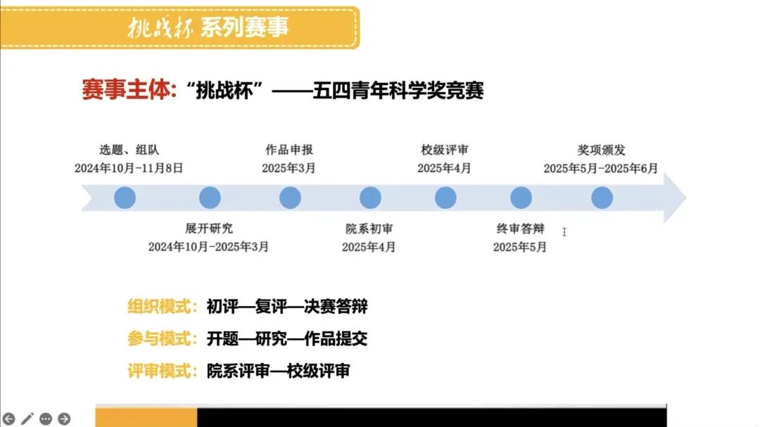 首先,校级宣讲团的汪文韬同学对“挑战杯”进行了详尽的介绍。汪文韬首先带领同学们回顾了“挑战杯”的发展历程并阐述了其赛事宗旨,接着详细说明了“挑战杯”赛事的多元化体系。本届“挑战杯”系列赛事通过设立“五四青年科学奖竞赛”、“跨学科类学生课外学术科技作品竞赛”以及“特别贡献奖”等三项赛事,为各位同学提供了适合自己的展示舞台。随后,汪文韬详细讲解了赛事日程安排、报名流程、作品提交要求及注意事项等实用信息,以确保每位参赛者都能准确把握赛事脉络,避免不必要的疏漏。他鼓励在场的同学积极参与,勇于挑战自我,希望大家都能通过“挑战杯”这一平台收获满满。