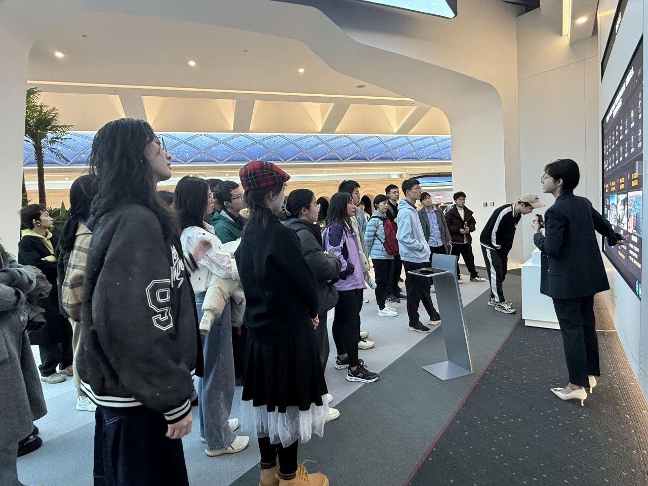 在工作人员的引导下,同学们首先走进华为北研所技术展厅,开启了一场前沿科技探索之旅。展厅内,讲解员为同学们细致介绍了华为在5G领域的研发成果和行业应用,以及华为在智慧城市、智能交通等领域的创新实践。同学们认真聆听,不时提问,与企业技术人员深入交流。参览过程中,同学们也“沉浸式”体验了华为最新数字终端产品,对华为的前沿技术和创新方案有了更直观的认识。