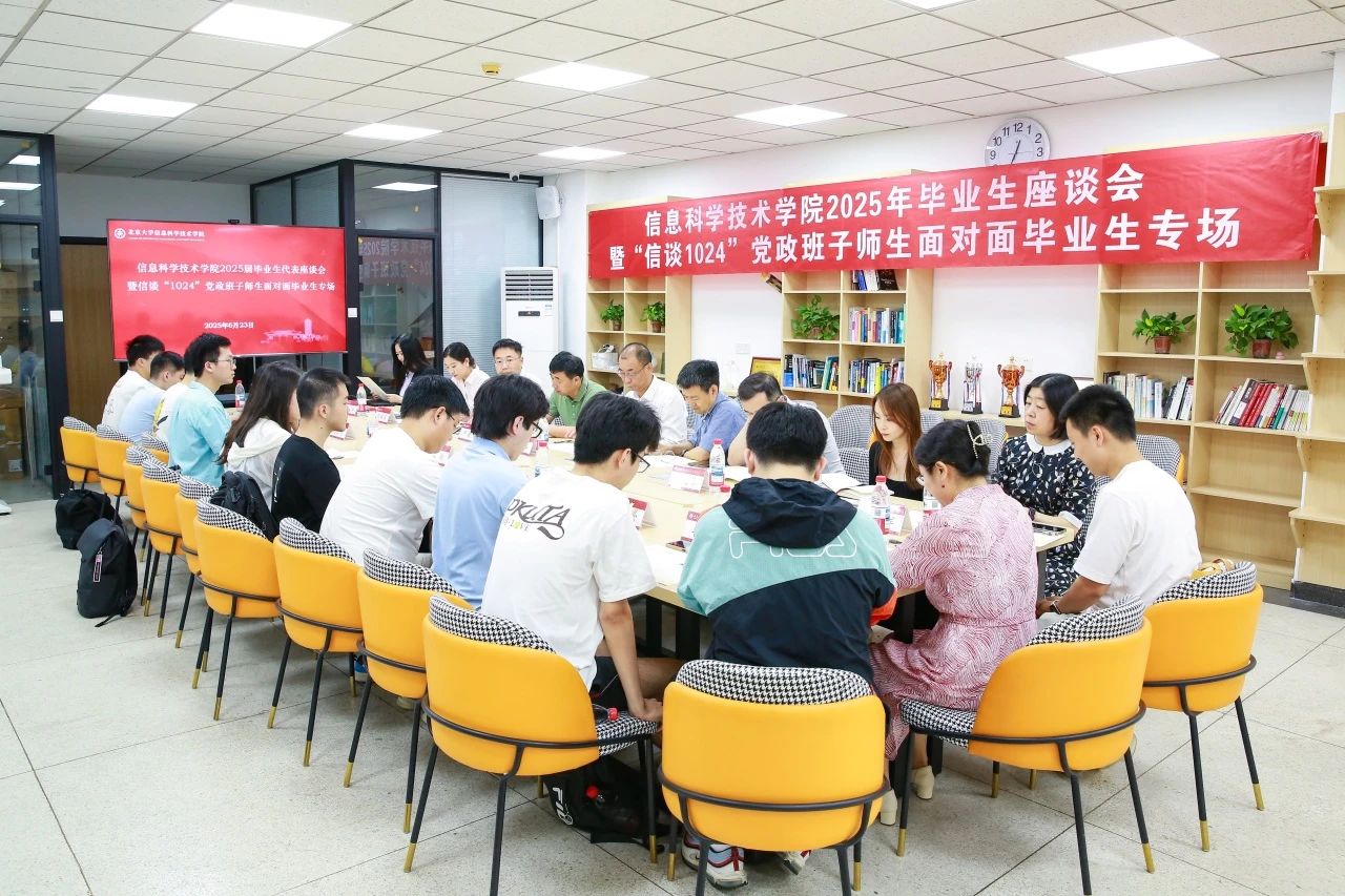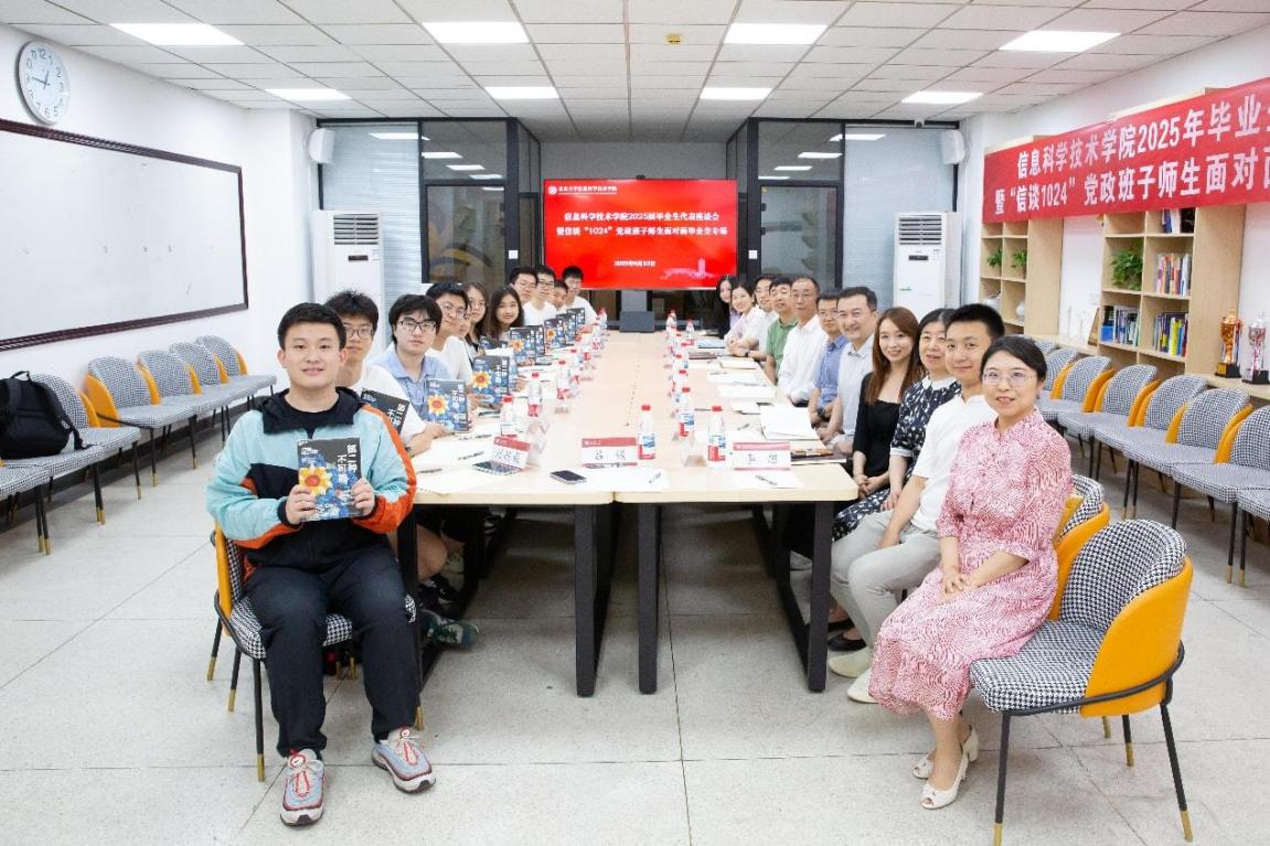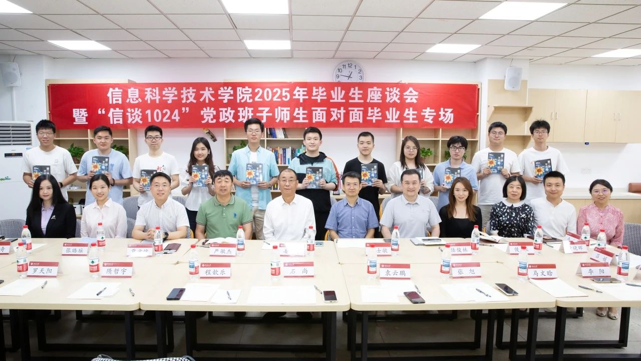 于理科一号楼1127会议室举办2025届毕业生代表座谈会暨“信谈1024”党政班子师生面对面毕业生专场活动。校党委副书记、学院2021级4班第二班主任姜国华,党办校办机要室主任、学院2021级4班第二班主任张璐瑶,党办校办年鉴与统计办公室主任、学院2021级6班第二班主任侯乐受邀与毕业生代表亲切交流。信科学院党委书记严敏杰、院长侯士敏、副院长陆俊林、党委副书记贾方健和教务办主任董晓晖、学工办主任李子奇等学院领导老师参会。活动由学院团委书记、毕业年级辅导员吕媛主持。