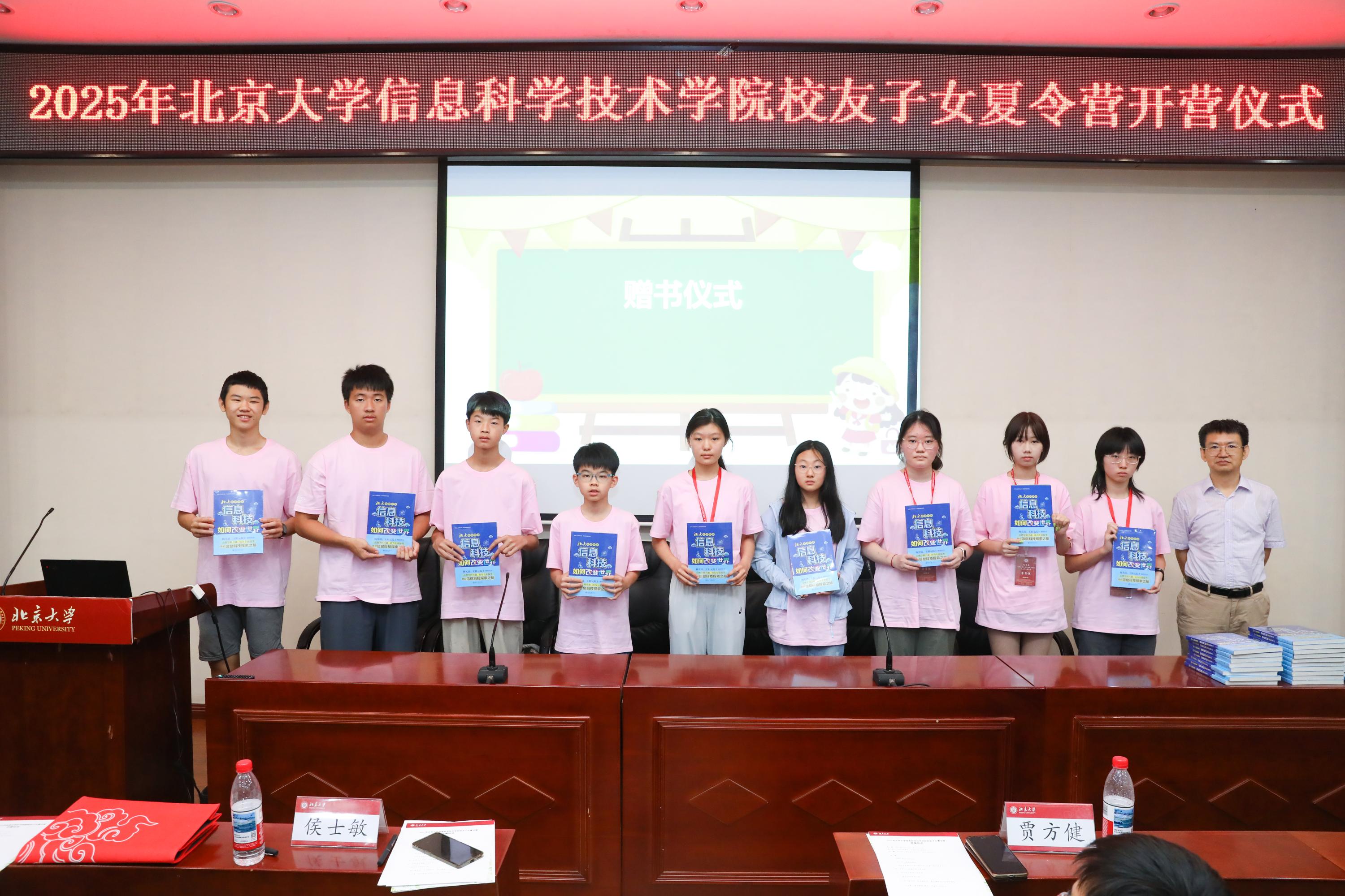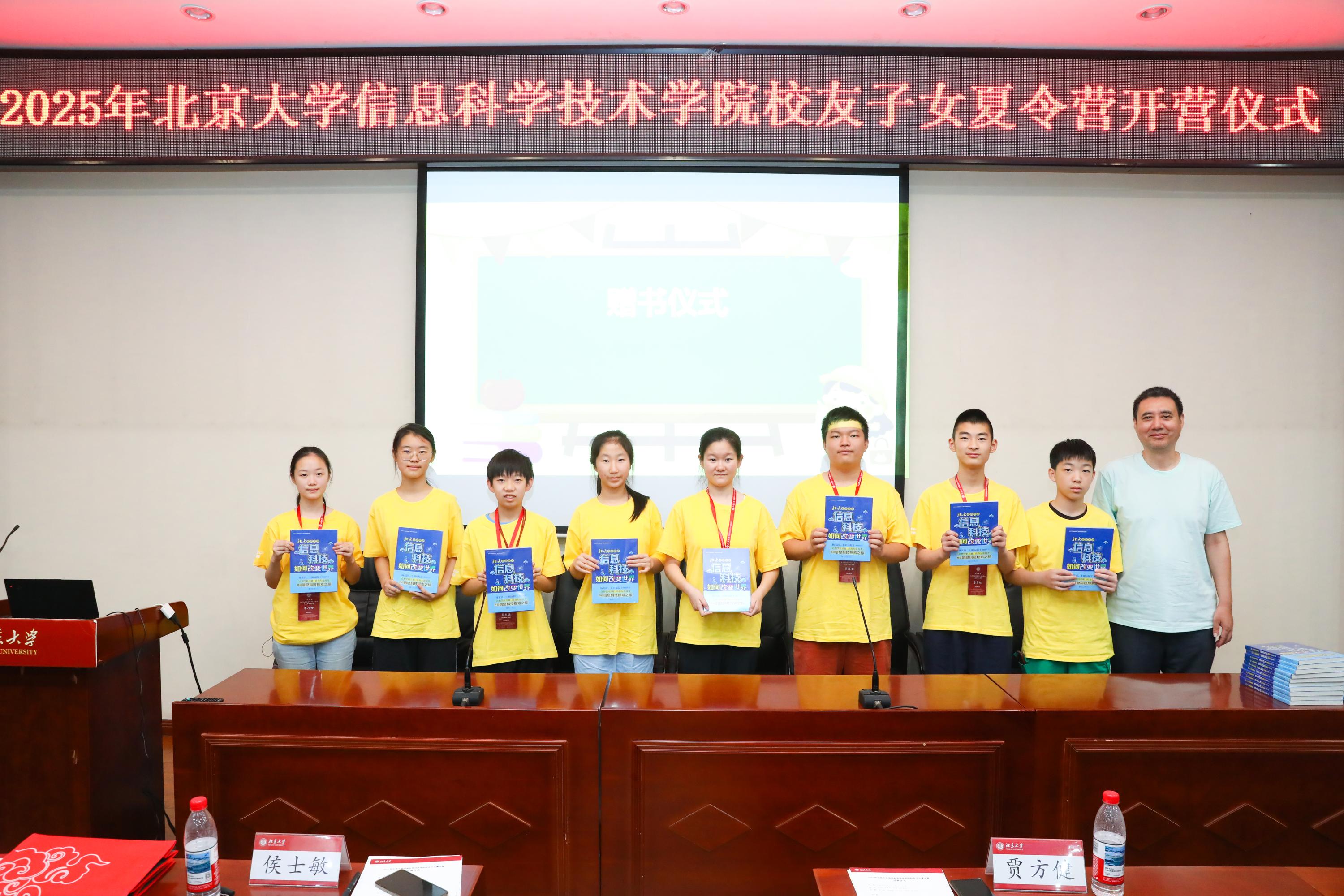 侯士敏院长发表了热情洋溢的致辞,他指出,希望同学们在本次活动中开阔视野、增长见识,亲身感受父母曾经学习和生活过的地方,体会巨大变化,通过交流碰撞,激发学习兴趣,未来成为推动科技变革和社会进步的新生力量。党委副书记贾方健对夏令营的纪律要求进行了详细说明,祝福同学们三天的北大之旅安全而愉快。李子奇介绍了夏令营的具体日程安排,学长团志愿者代表分享了自己在北大的求学经历和成长感悟,鼓励营员们勇于探索。仪式的最后环节,侯士敏、邓斌和贾方健共同向营员们赠送书籍《信息科技如何改变世界》,勉励他们勤学善思。