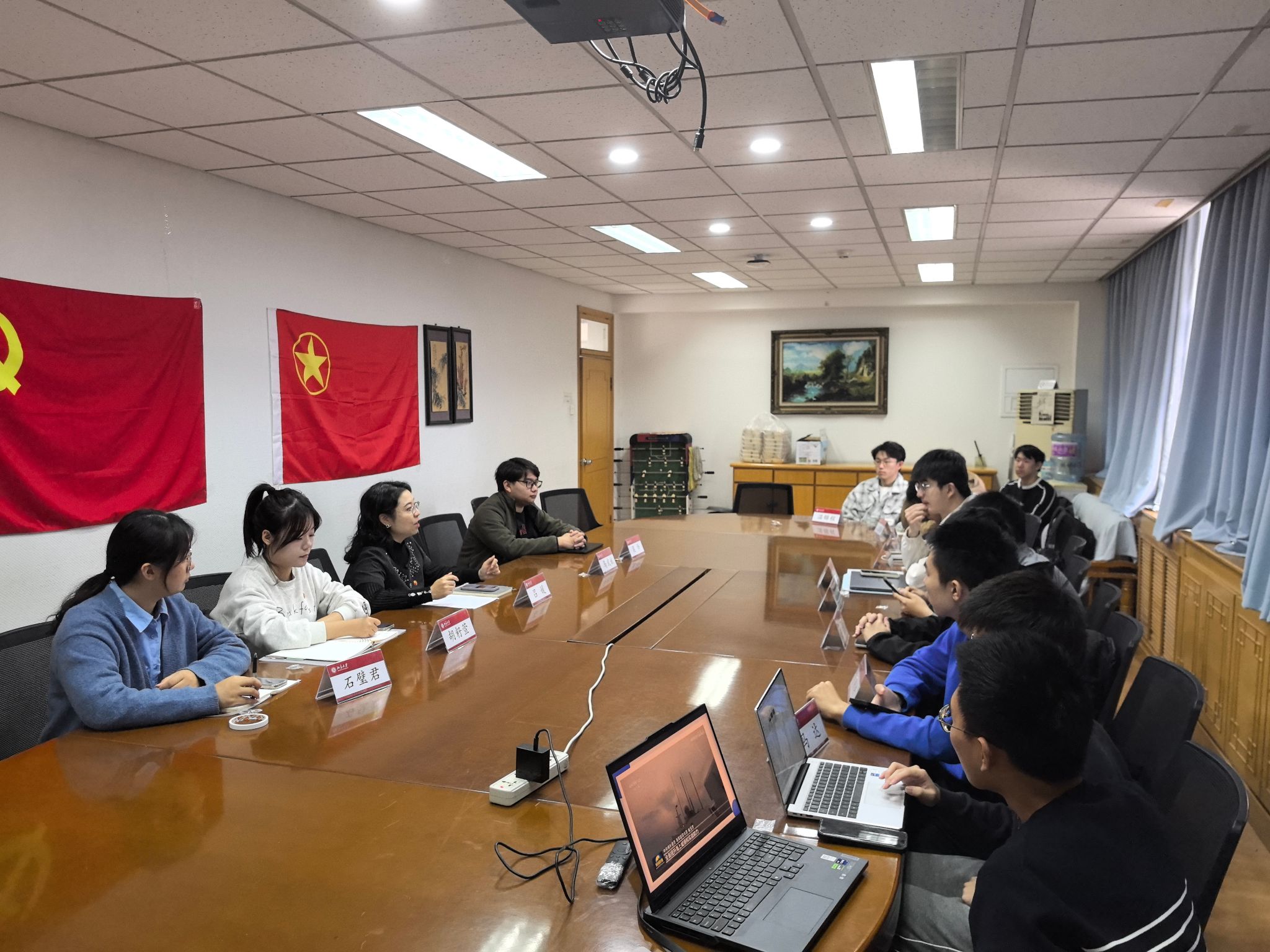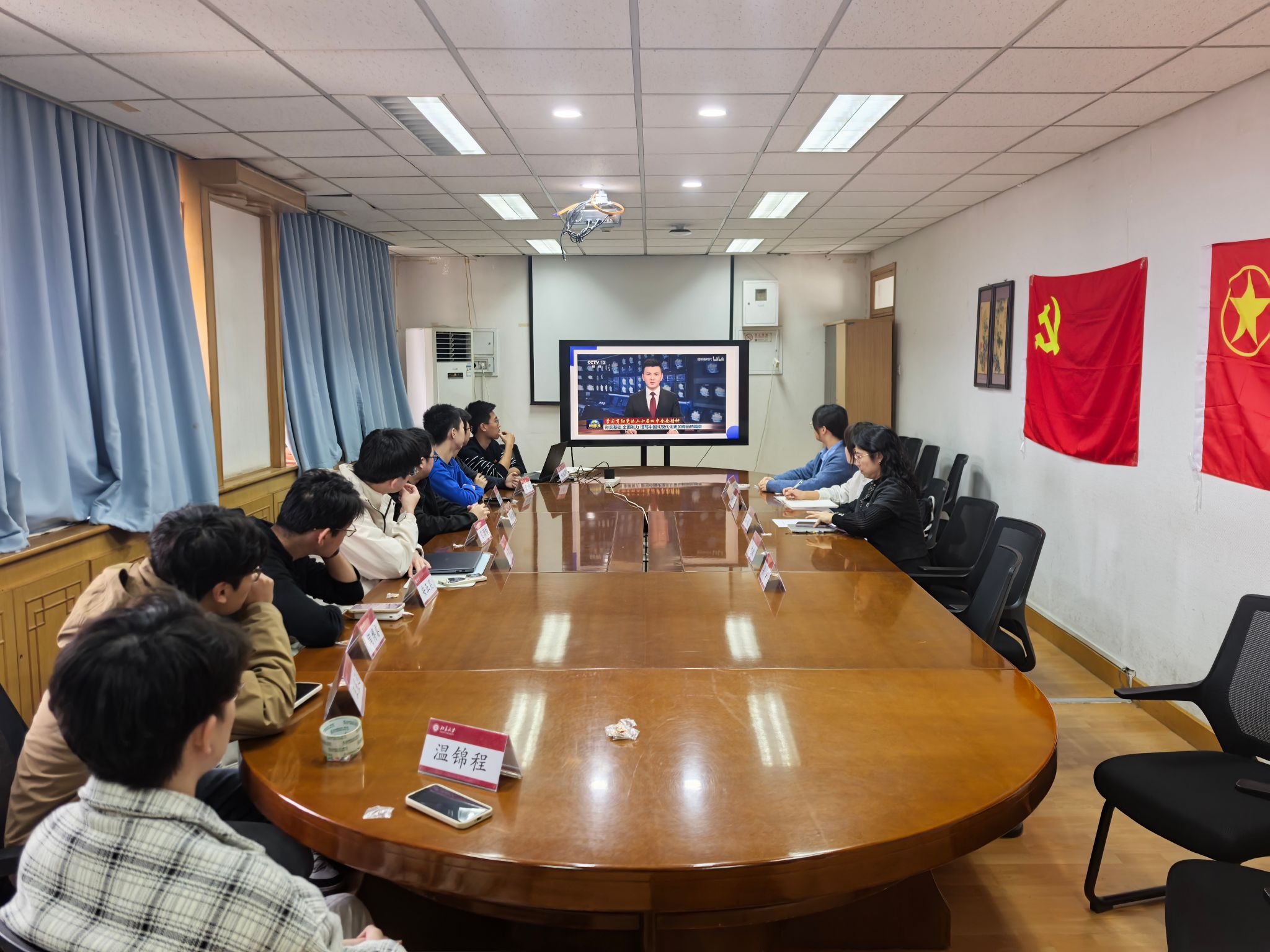 团委在理科一号楼1801会议室集体学习党的二十届四中全会精神。学院团委书记吕媛主持会议,团委副书记胡籽萱、马武斌、梁怿、石璧君及团委各职能部门负责人参加会议。