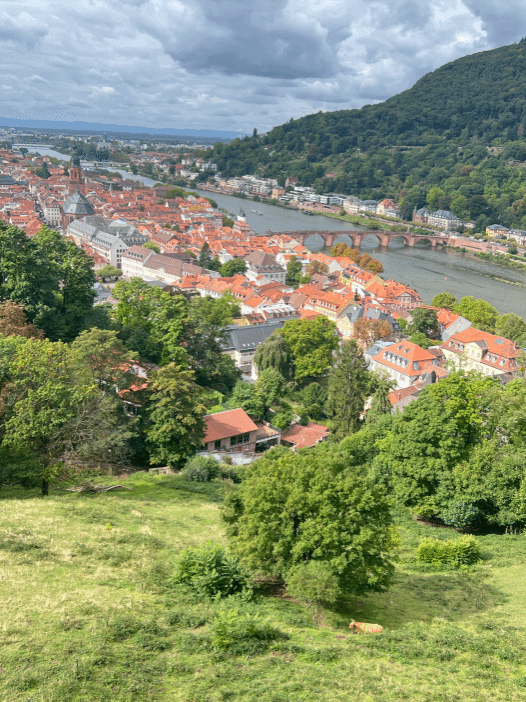 论坛所在的大学广场(Universitätsplatz)坐落于主街,与远处王座山上海德堡城堡(Heidelberg Schloss)铅灰色的城墙遥遥相望。我沿着老桥(Alte Brucke Heidelberg)跨过静静流淌的内卡河,沿收窄的石壁攀登而上,踏上相传留有黑格尔与歌德足迹的哲学家小径。小径两旁植被葱郁,枝头挂满应季柑橘,晴空下的内卡河波光粼粼。海德堡主城区建筑普遍低矮,赭红屋顶与远处茂密群山相映成趣,典雅而清新。初抵海德堡,她的宁静幽美便使我不自觉地内心安定,只需悉心感受便能从处处细节中品察出无穷意趣。